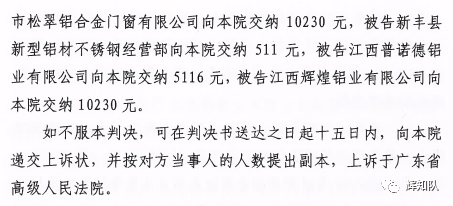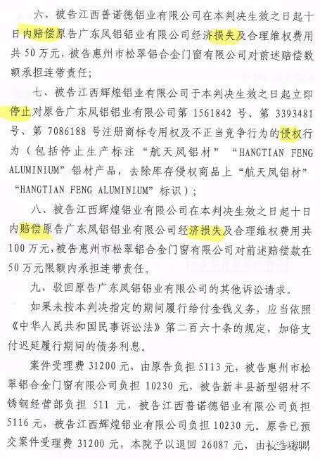 安徽凤铝系列维权案:诉辉煌公司等四被告,法院判赔250余万